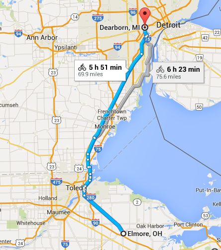 Days with 4,000 vertical feet of elevation rise are physically exhausting. Days with 400 feet of vertical elevation rise are just tedious. The trip from Elmore, OH to Dearborn, MI is so flat the only times I downshifted was to climb overpasses.