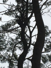 Last year we nested near the top of a tall tree, far from any trail. I like this year’s spot better. Lower down, less windy, where the trunk splits into a sturdy fork. It took Jake less than a day to form the nest. And we’re just a head turn off the main path. Might as well make viewing easy.