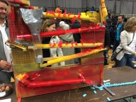 On Friday morning, teams gather and assemble their gizmos on tables lined up in MIT’s field house. The public begins to arrive at one o’clock. They check out the entries while Arthur Ganson, a kinetic sculptor, interviews each team and projects their creations on large screens. The crowd grows. By 3:30 p.m. over 1500 people cram the bleachers and spill out onto the floor. Mr. Ganson makes everyone feel welcome. “These constructions illustrate principles of physics. Sometimes, they may need an extra push, or an external hand. These other forces of spirit are welcome.” A poetic way of saying, don’t sweat a glitch.