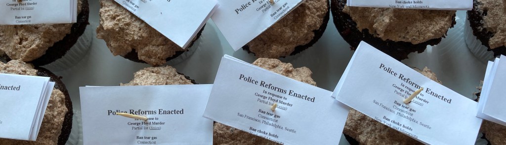 A few weeks ago, I told the regulars that I planned to stop on May 25, one year after George Floyd was murdered. I posted fresh signs to mark the anniversary. We enjoyed a boost in turnout, and afterward some cupcakes I made, with a flyer of police reforms instigated during the past year toothpicked into the icing. A tangible, if checkered set of accomplishments, none of which even remotely ascribable to our vigil.