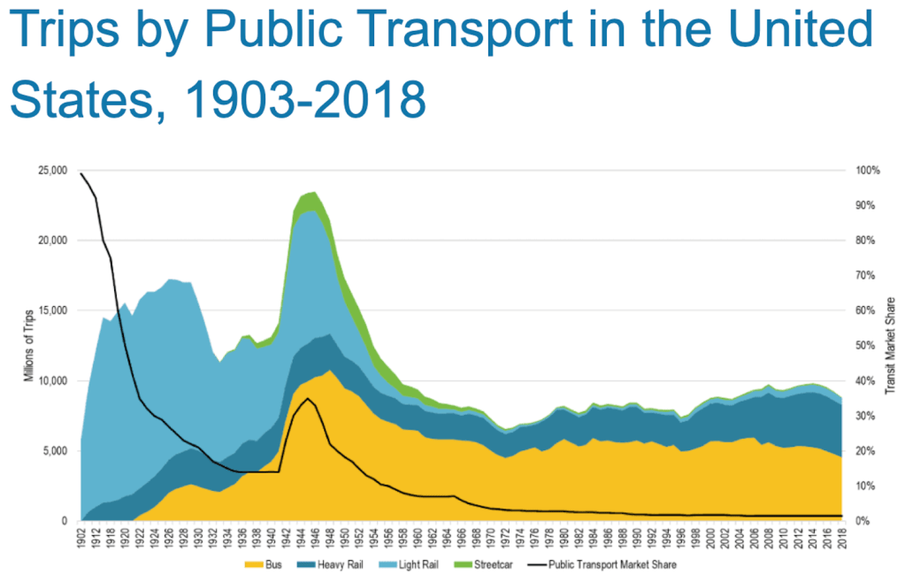 Public transit use has been in free-fall for the past 120 years, except for an uptick during World War II when Americans actually modified individual behavior for a perceived greater good. How quaint!