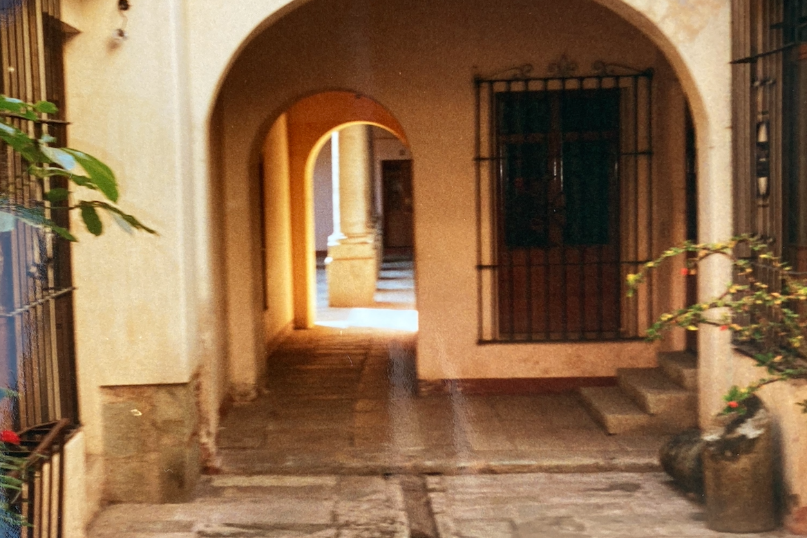 We were left in front of a pair of great wooden doors, at least eight feet wide and ten feet high. Thick planks with hefty cross frames, bolted tight against the night. We pulled the iron bell and a smaller door, carved within the larger leaf, opened to let us in. Hotel Monte Carlo is a typical urban building of Mexico, though I had no way of knowing that at the time. I simply knew that I loved the place. The procession of arches before us, the courtyard open to the sky, the grand stair that split symmetrically and then reunited overhead, the turned ironwork, the lantern flickering in the distance, all pulling us inward. In the morning I would understand the double courtyard arrangement; a formal front court with potted plants, reception desk, and dazzling tile work; and a rear service court with an old well and two aging pick-ups that drive through the lobby to reach the street. It is a common arrangement in Mexico. But on this first night, with the brackish sky blurring what is indoors and what is out, the dimply lit spaces were not notable as architectural precedents. They were fascinating as mystery.