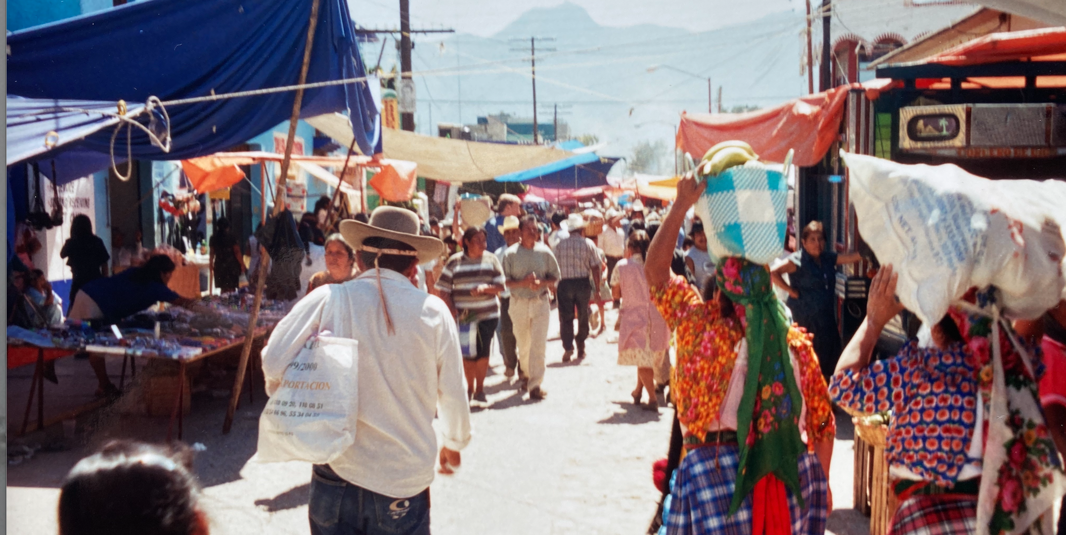 Market stands begin immediately outside the bus station and move uphill toward the center of town. Some sell plastic ware and trinkets, the stuff of dollar stores in the United States. Some sell food: avocados and bananas; wild turkeys; biftec sizzling from an open flame; chicken wrapped in tortillas; dried pork rind; dried fish; dried peppers; liquado of papaya; chocolate; hard candy; and of course, chapulenes. Some stands are loaded with household items: felt hats; walking canes; rough cotton shirts; polyester slacks; blue jeans; baseball caps; T-shirts emblazoned with Britney Spears and Creed. Near the crest of the road, close to the Cathedral and the Zocalo, are handicrafts: booths of embroidered blouses; stitched vests; sparkling tin; chiseled hides; blackened pottery; and intricate beading. There is a general procession from the tacky through the everyday to the exotic, yet a woman selling baskets braided from ancient patterns might also hawk plastic tote bags in fluorescent colors, galvanized wash buckets, and refrigerator containers with snap-tight lids. Tarps are strung across the street, offering partial cover that create dramatic shafts of light while trapping the pungent scent of roasted goat and ripe mango.