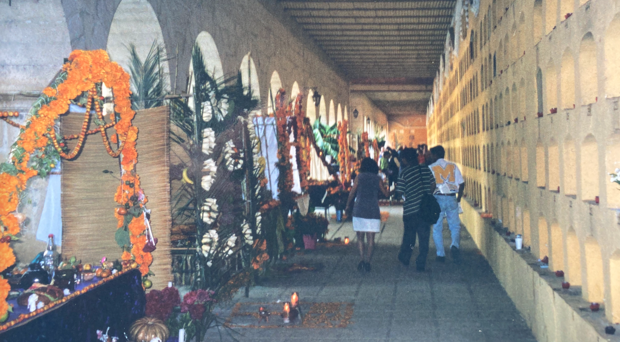 Near midnight, in the ancient cemetery of Xoxocatlain, hundreds of people sat around the graves of their ancestors. They brought food and flowers, cards and photos, camp stools, shawls, and candles. They drank and talked and sang as casually as if there were in a kitchen. Foods and artifacts for the deceased were arranged around the tombs, to welcome the spirits back.