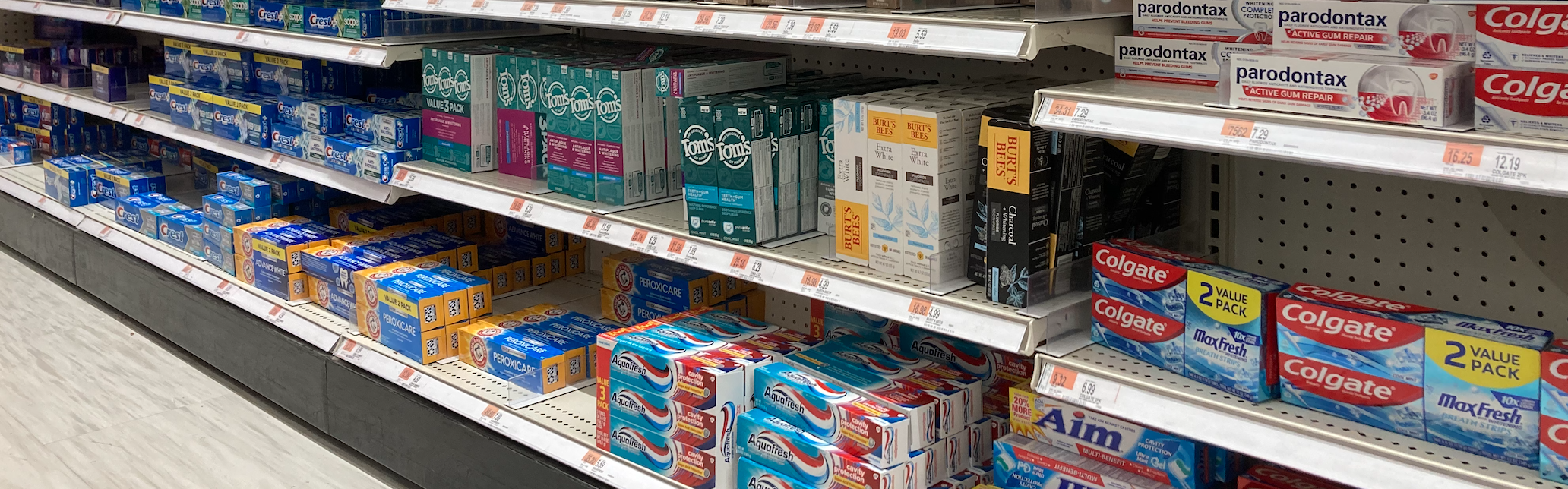 There are over 330 million people in the United States; almost all of us use toothpaste. The American toothpaste market is dominated by two major brands: Colgate (36% market share) and Crest (30% market share). That leaves a third of the playing field for all those down-market brands, such as Aquafresh, Ultrafresh, Arm & Hammer, and that 50’s favorite, Pepsodent; plus the niche pastes like Sensodyne, Parodontax, and Pronamel; as well as the preferred choice of the crunchy set: Tom’s of Maine.