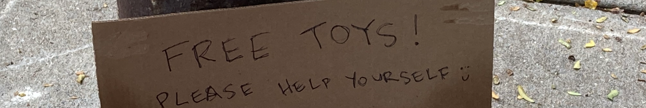 Sometimes they put out useful, pricey items that have outlived their usefulness. Even with some thought involved. The Nordic Track with the sign that shouts, “Free! It works!” The stroller that bears a heart and a motto: “I hope that your child loves it as much as mine did.” With just a bit more effort these folks could post on Craigslist FreeStuff and connect with a viable user without creating a public tripping hazard.