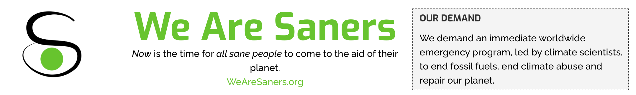 His analogies to NASA and the Manhattan Project are reflected in We Are Saners’ simple, clear demand statement: We demand an immediate worldwide emergency program, led by climate scientists, to end fossil fuels, end climate abuse, and repair our planet. Regardless how one views men dropping atomic bombs or walking on the moon, one cannot dispute that when faced with impending disaster, giving scientists free range to address a specific problem has been both efficient and effective. What if we could harness that capability for something more peaceful than Hiroshima, and less narcissistic than winning a space race? What is we could harness it allow our planet to continue to sustain human life?