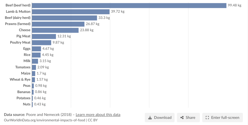 Consider this graph featured on the OurWorldinData website. Beef is the worst offender: generating almost three times more greenhouse gas per kilo than its nearest competitor: mutton. In fact, all of the top eight greenhouse producing foods are animal based. Not until we arrive at rice (twenty times less environmentally destructive per kilogram than beef) are any plant-based foods listed. Clearly, meat is terrible for our environment, and the implication is: anything else must be better. Right?