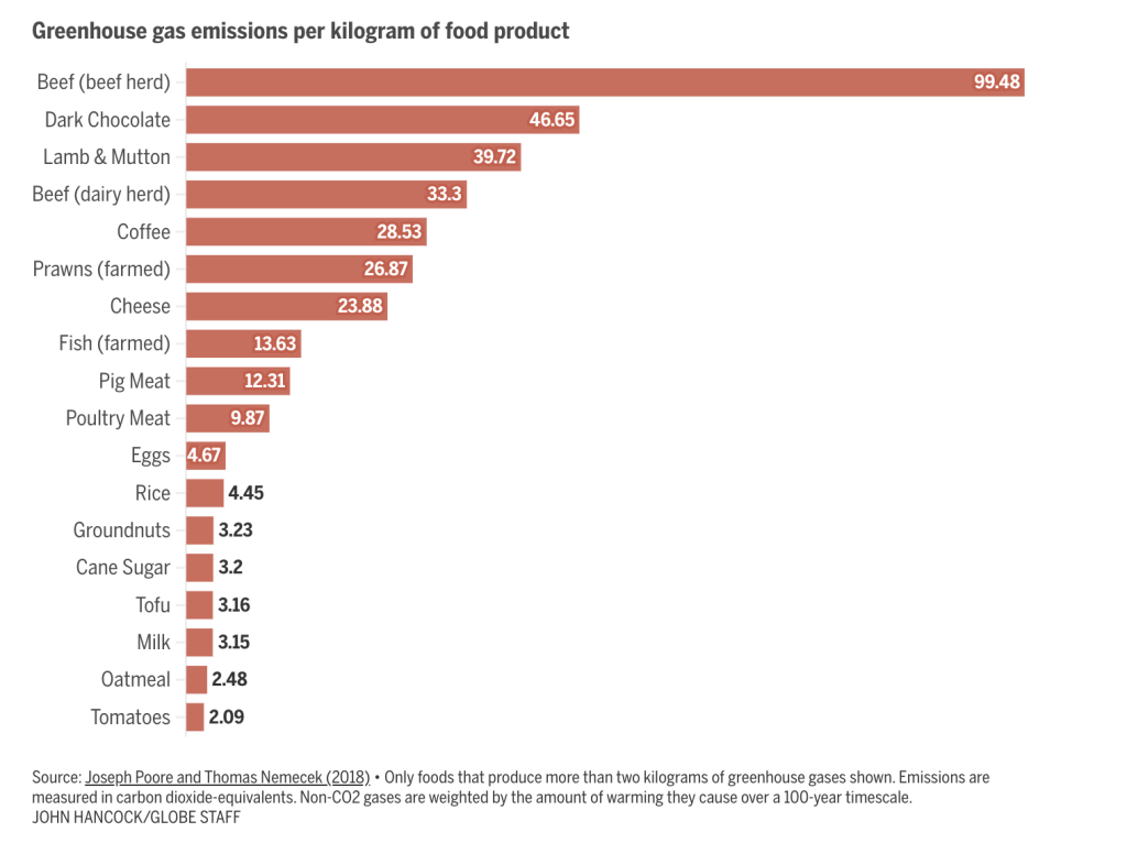 Not so fast. A very similar graph in The Boston Globe includes several foods not listed in OurWorldinData, even though both graphs cite the same research source. Dark chocolate weighs in at number 2: only half as bad as red meat. Coffee shows up at number 5: ahead of cheese and pork and chicken. Cane sugar, tofu, even oatmeal makes the list!