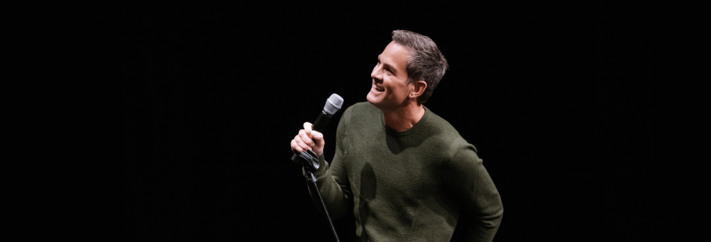 Stage Manager leaves. Jared opens box. Finds a single piece of paper that directs him to read whatever comes on the screen. A large screen illuminates, and Jared starts to read. It’s awkward. It’s funny. Jared figures out he’s only supposed to say normal case words out loud (italics are stage directions). Whoever is manipulating the illuminated pages has a sense of humor.